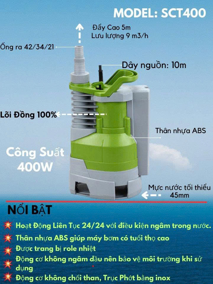 Đánh giá Bơm chìm nước thải thân nhựa ABS SHIMANO SCT400 Công suất 400, Mô tơ lõi đồng
